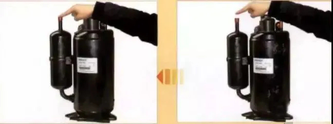 首先,將壓縮機(jī)卸下, 加電使其運(yùn)轉(zhuǎn),用手指堵住壓縮機(jī)的排氣孔片刻, 再將手指移開。 由于壓縮機(jī)內(nèi)有壓力, 所以當(dāng)用手堵住壓縮機(jī)的排氣孔時, 應(yīng)感到有排氣壓力;當(dāng)把手指移開時, 可以聽到 “呲呲的排氣聲, 而且排氣壓力正常的壓縮機(jī),應(yīng)很難堵住壓縮機(jī)排除的氣體,這表明壓縮機(jī)性能良好。如果用手堵住排氣管時感覺不到壓力, 將手指移開時,聽不到排氣聲, 則說明該壓縮機(jī)性能不良。如下圖所示: