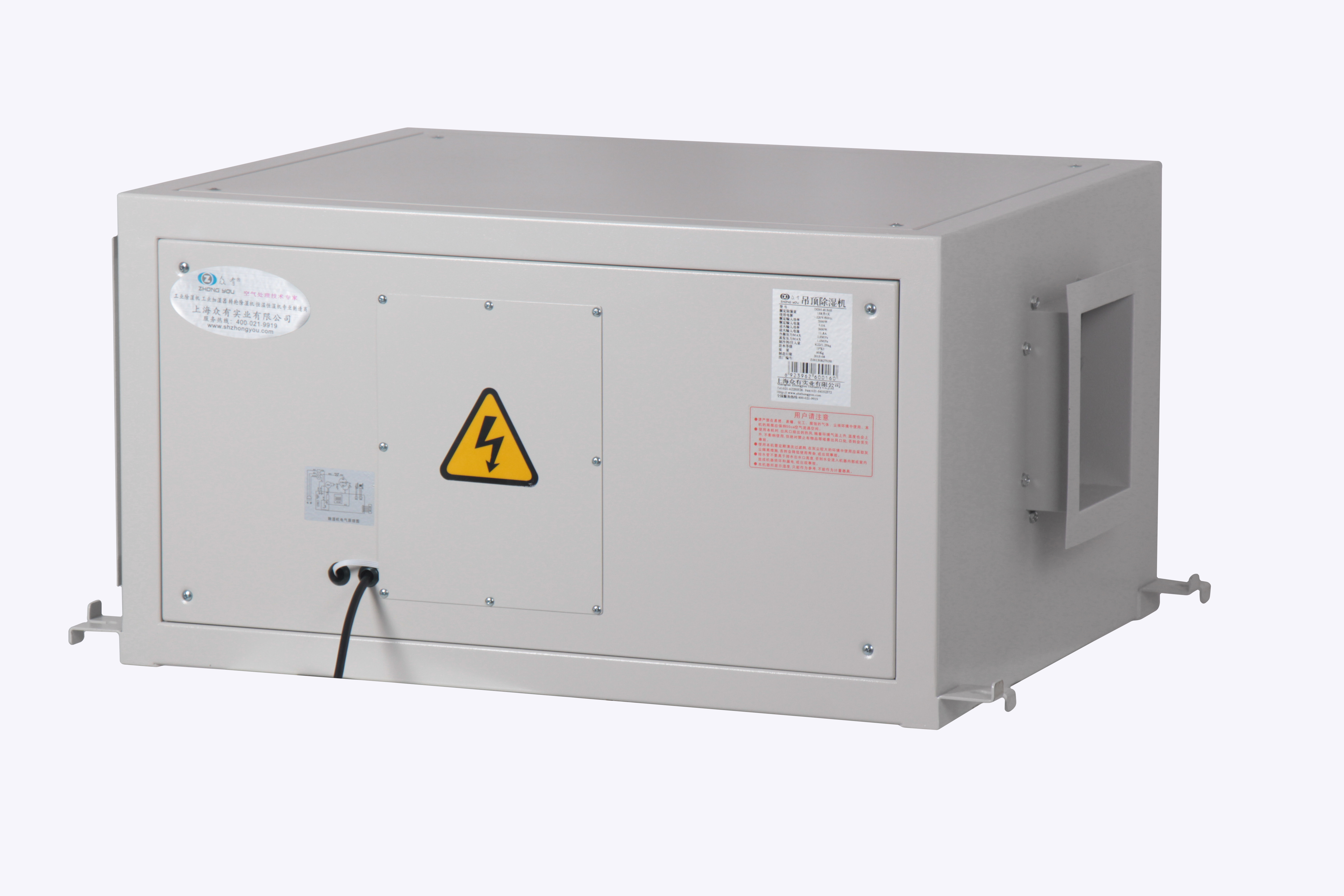吊裝吸頂式除濕機機身設計美觀大方,結構緊湊小巧,可以輕松的外掛于天花板上或者靠墻坐地式安裝,符合您對室內(nèi)裝潢設計的要求。