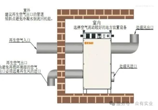 除濕機(jī)置于室外:干空氣出口和處理空氣進(jìn)口連接到除濕區(qū)域。再生風(fēng)入口和濕空氣出口不需要連接管道。