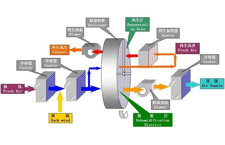 轉(zhuǎn)輪除濕機的核心結(jié)構(gòu)是一個不斷轉(zhuǎn)動的轉(zhuǎn)輪,是由特殊復合耐熱材料制成的波紋狀,載有吸濕劑的蜂窩狀轉(zhuǎn)輪,蜂窩狀轉(zhuǎn)輪具有吸濕比表面積大、流通阻力小、除濕效率高等特點。