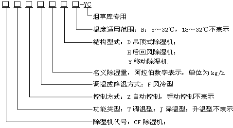 型號(hào)示例: CFZF20-YC 表示名義除濕量為20kg/h,進(jìn)風(fēng)溫度18~32℃,固定式自動(dòng)調(diào)溫型煙草庫專用除濕機(jī)組。