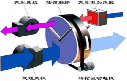 當(dāng)處理空氣通過(guò)轉(zhuǎn)輪的處理區(qū)域時(shí),其中的水蒸汽被轉(zhuǎn)輪中的吸濕介質(zhì)所吸附,水蒸氣同時(shí)發(fā)生相變,變?yōu)橐簯B(tài)水,并釋放出潛熱;這時(shí),處理空氣因自身的水份減少而變成干空氣;之后,處理空氣由處理風(fēng)機(jī)送出,變成干的、熱的空氣。